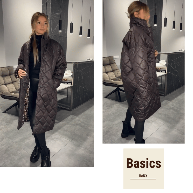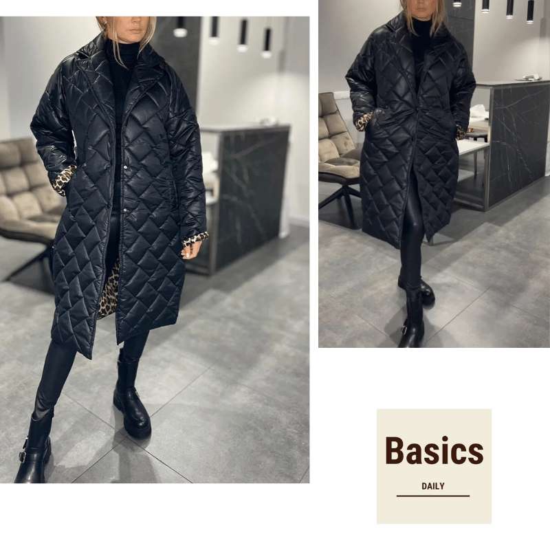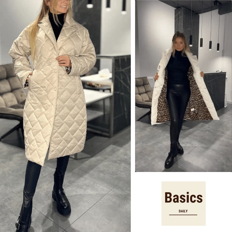 Tento kabát kombinuje vytříbený styl s útulností a elegantně vás provede zimní sezónou. Jeho kosočtvercový vzor je jednoduchý a elegantní a podšitý leopardí potisk dodává vzhledu šmrnc.